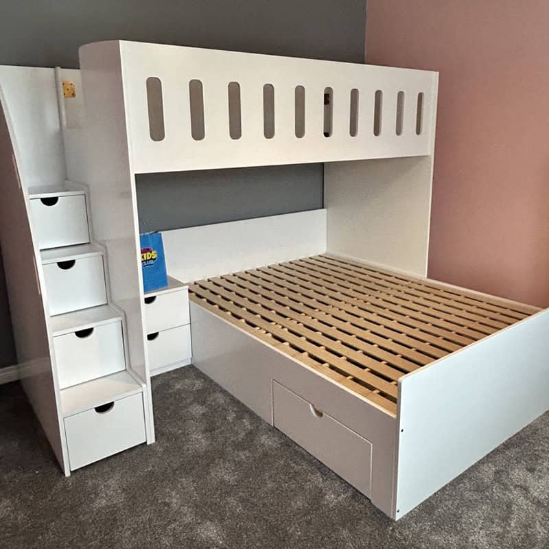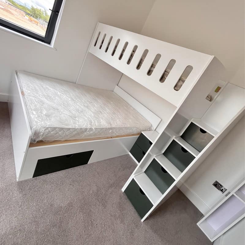This is our double and single L shape bunk bed. This bunk is a standard size single bed on top (90cm x 190cm) and a standard size double bed below (140cm x 190cm). Also available in the double above at 190×140 cm. It also comes with four drawers in the stairs, and two drawers for storage underneath the bottom bed. This bed also includes a bedside table with two drawers. The colour of the drawer fronts can be changed to suit your room in the options above.
