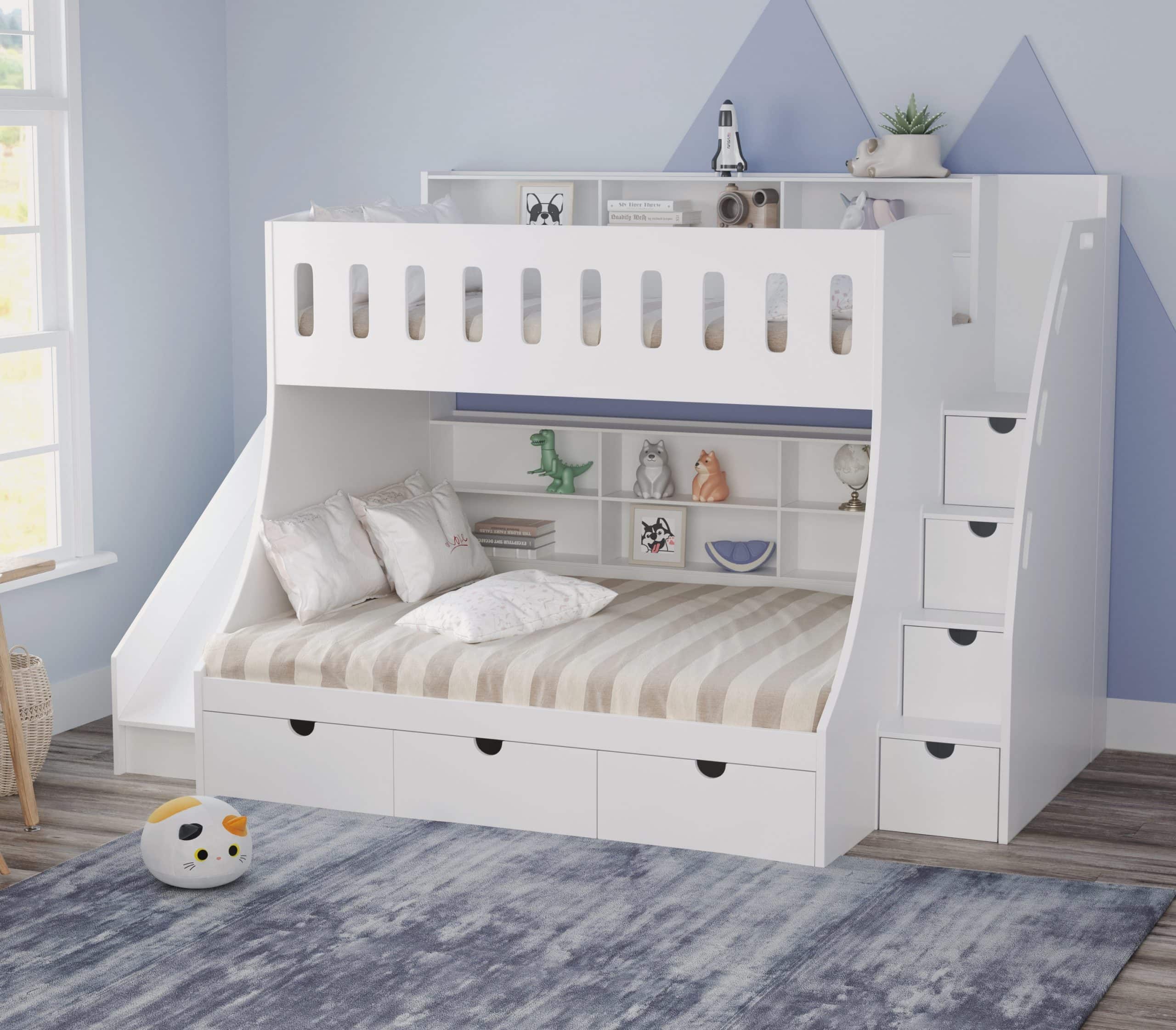 Storage Options | Underbed drawers, staircase compartments, built-in bookshelf integrated into frame |