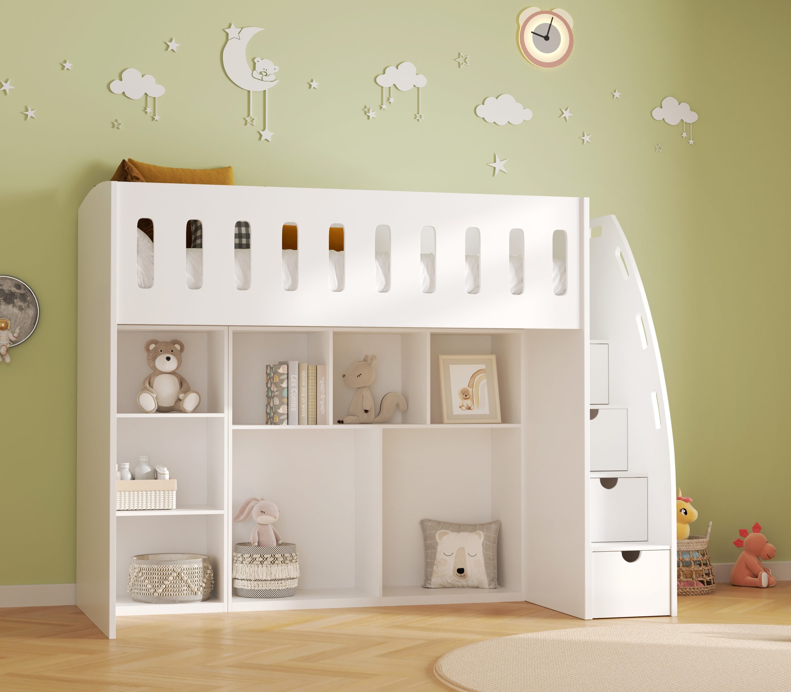 This is our very popular high sleeper with shelving . This high sleeper with shelving is a standard size single bed (90cm x 190cm) This bed comes with four drawers in the stairs. The space underneath the bed can be used for storage and previous customers have used this space for seating areas and desks etc.