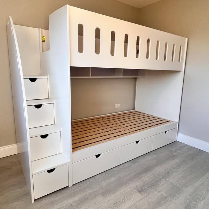 For a space-saving, tall bunk bed that prioritises safety, storage, and style, the Tall Bunk Bed with Stairs by MK Furnishings is the perfect choice. Create a functional, safe, and stylish bedroom for your children. Shop now and experience the ideal blend of practicality and elegance!